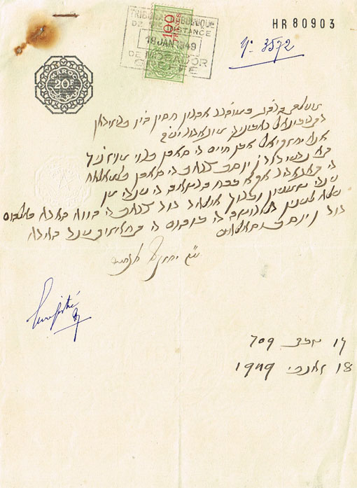 פניה לאהרון חסין ראב"ד מוגאדור של יחזקיאל אבן חיים שבה תובע את דוד ן' יוסף צראף שמכח ההרשאה שיש לו מידי שמעון וברוך בני דוד צראף שהא אמר להם על ענין הירושה של אביהם שניתנה לדוד ן' יוסף והיה זה 17 טבת 709 18/7/1949 וחתום בצורה מלומדת יחזקאל אבן חיים