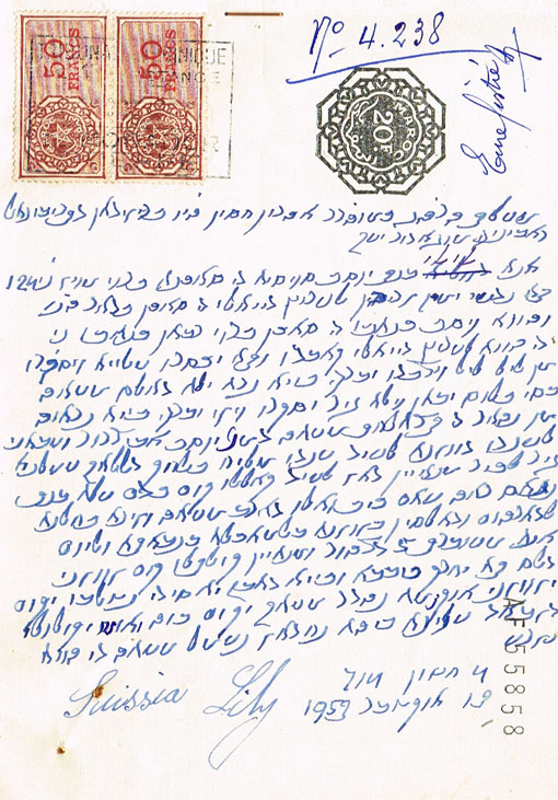פניה לאהרון חסין ראב"ד מוגאדור של לילי בת יוסף סויסיא ובה תובעת את ימין זריהן הארוס שלה הוא ויוסף כנאפו שהם שניהם מעליבים אותה ומשתכרים כל לילה והארוס שלה שולח את יוסף לקלל אותה מיום שהשלימה עם וכיום היא מעוברת כבר חמישה חודשים וכאשר אמרה לו קום והינשא לי קם והחל לקלל אותה ואת אביה וכעת דורשת שורת הדין והיה זה 4 חשון 714 15/10/1953 וחתומה בלועזית