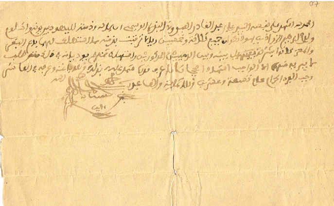M. Ali Abdelkader Lâboura, atteste et reconnait qu'il a une dette vis à vis des deux commerçants Juifs M. Shalom et Yona fils de Abraham Azerad qui s'élève à 53 Rials, prix de leur part dans la vente de (vaches et chèvres). Il s'engage de payer la dette à la simple demande des associés.