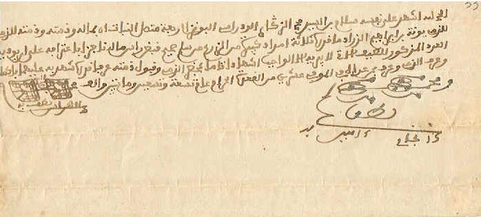 M. Slam ben sayd Mohamed Zkari Lwadrassi, atteste et reconnait qu'il a une dette vis à vis du commerçant Juif M. Yona ben Abraham Azerad du Mellah de la ville de Tétouan, qui s'élève à 3 grands Moud (Unité de mesure de blé) et s'engage de les restituer pendant l'été prochain.