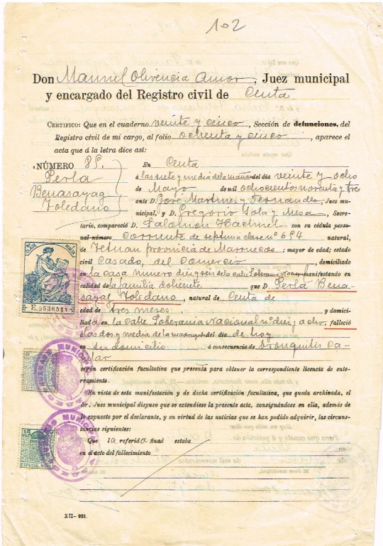 ENREGISTREMENT DE DÉCÈS DE PERLA BENASAGAG TOLÉDANO AU REGISTRE CIVIL DE CEUTA