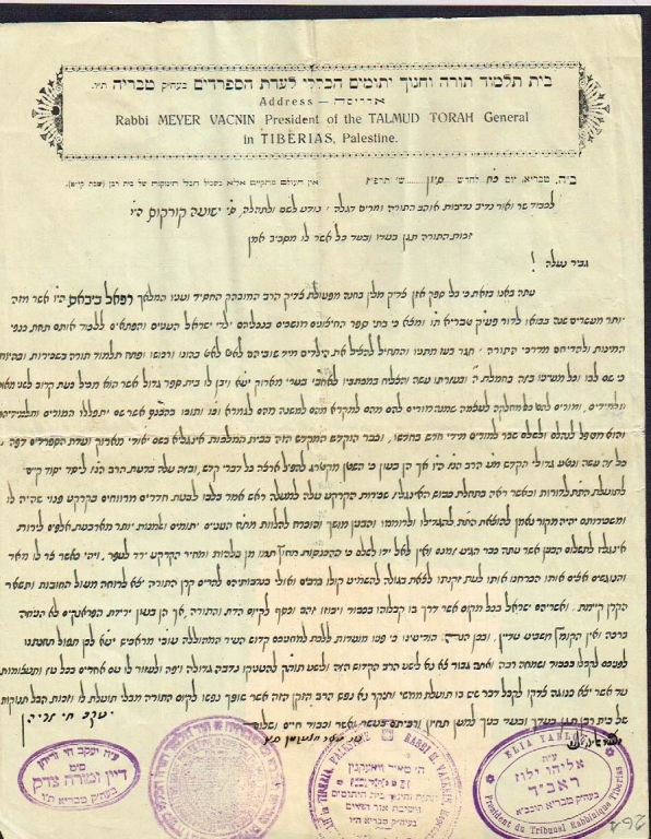 מכתב לישועה קורקוס ובו בקשה והסבר על קורות חייו של רפאל ביבאס אשר זה יותר מעשרים שנה שבא לגור בטבריה ומצא שבתי ספר חיצוניים מושכים אליהם ילדי ישראל העניים ללמד אותם מינות ולהדיחם מדרכי התורה והוא התחיל להציל את הילדים מיד שוביהם ולאט לאט פתח תלמוד תורה ועשה והצליח במכתביו לאנשי מרוקו ומבקש ממנו לתרום לעזרת התלמוד תורה בטבריה שנקרא בית תלמוד תורה וחינוך יתומים הכללי לעדת הספרדים בעיר טבריה והיה זה יום כ"ח סיון שנת תרפ"ח וחתומים מאיר ואעקנין יעקב חי זריהן