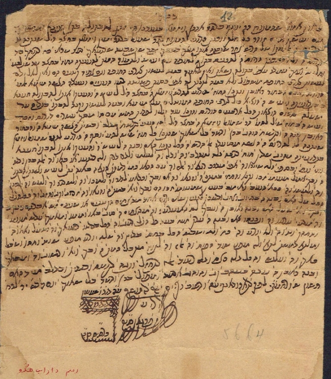 בהיות אמת וצדק שהמנוח יוסף בן אהרן ויזמאן כשהיה חי נתן לבתולה בתו חנינא המשודכת עם יעיש ן' חיים זוהר כל חלק וזכות הידוע למנוח שמואל בן ימין ויזמאן שנתנה לו אלמנתו ולא הספיק להכניס בתו לחופה עד שנפטר ואחר כך עמדה הבתולה ונישאה ואין לאמה במה לעשות צרכי חופתה וגם אחיה קטנים ואז עמדה האישה מימא אלמנת יוסף ואבי הבחור ראובן ונתנו החלק הידוע לו בחצר ליעיש והעניקו אותו לבתולה חנינא ויעיש עשה כל צרכי החופה ועוד פרטים על החצר הנזכרת תארודנאת והיה זה יום ד' בשבת י"ד חשון שנת ורחמת"י לפ"ק וחתומים משה ן' יפרגאן דוד ן' שמעון ברסיס