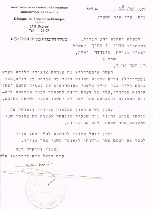 מכתב לאהרן בן חסין ראב"ד מוגדור ובו מודיע לו כי האישה איסטריליא בת אברהם אזגורי ילידת פארא בברזיל היא אלמנת דינר בן אברהם בן דו"ח אשר מחמת חוליה מינה בית הדין אפוטרופוס על נכסיה את יצחק אוחנא וכעת הוא רצה להצטרף למשפחתה לכן מבקש מבית הדין למנות לה אפוטרופוס שני ולכן מתבקש בית הדין להורות ליצחק למסור את הכסף לאפוטרופוס השני אספי והיה זה ט"ז אייר תשט"ז 16/4/1956 וחתום רפאל ר"א בירדוגו