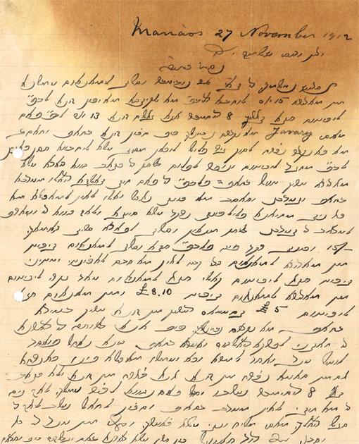 מכתב לשלמה ובו מודיע לו שהגיעו ב-26/11 למאנאוס ממאדירא והיה להם טוב שם שלא פגש מימיו ומסביר לו כמה טוב במקום שהגיע מאנאוס והיה זה 27/11/1912 וחתום דוד