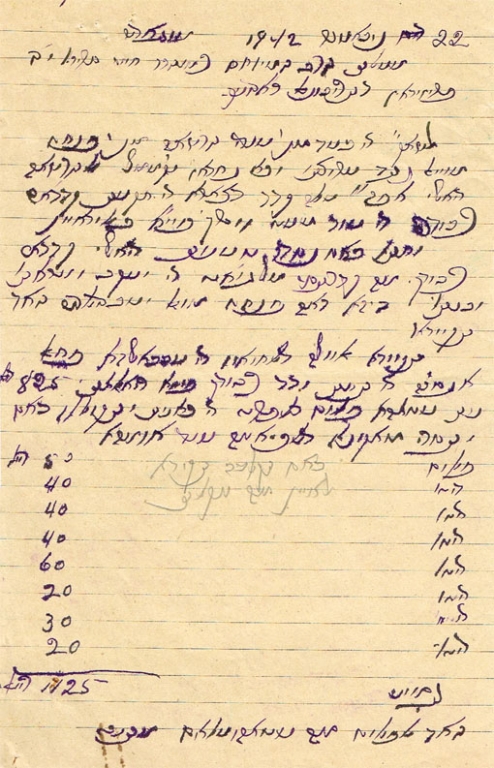 פניה לחיים סירירו ראב"ד מוגאדור ובו מודיע לו כי יש לו הרשאה מאת פנחס מוייאל נגד ארוסתו ולא היה יכול לטעון את טענותיו מהצעקות של יעקב ואשתו ובתו ומצרף רשימה של חפצים וכסף שהיו בין החתן לארוסתו מוגאדור והיה זה 22/11/1942 ואין חתימה