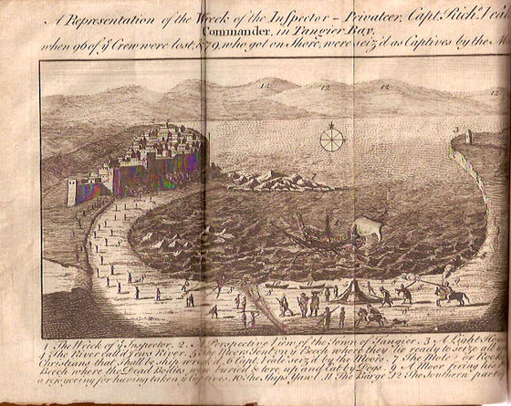 Both editions have plates of « Muley Abdellah, King of Mequinez and Fez, Emperor of Morocco and Grand Sheriff of Mahomet, » the wreck of the Inspector in Tangier Bay, the captives being driven into the Interior, Mowlai Abdallah's massacre of 335 of his own subjects, Mowlai Abdallah's camp near Fez, Slaves at work at Busioram. Most of these plates were reproduced in Pellow's « Adventures » (ed. 1890). No. 1945. See also Drake's Voyages, pp. 497-310.