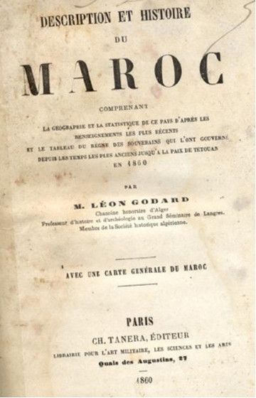 1860. Godard Léon. Chanoine honoraire d'Alger. – Description et Histoire du Maroc, comprenant la géographie et la statistique de ce pays, d'après les renseignements les plus récents et le tableau du règne des Souverains qui l'ont gouverné, depuis les temps les plus anciens jusqu'à la paix de Tétouan en 1860. Paris: 2 vols., 8vo, pp. 680, continuous pagination, with map. Reviewed by M. Malte-Brun in « Nouv. Ann. Des Voyages, » t. iv. of 1860, p. 112.